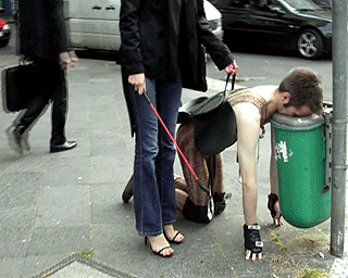 See how a demanding Mistress has fun on a sunny sunday afternoon, while she rides her human pony trough the busy streets of Duesseldorf. First I make him take a deep smell at a trash bin, before I guide him leashed through the street. But this is only the start of the riding day, and so I take place on the comfortable saddle that is attached to my ponies back. Of course my riding crop is with me and hits ponies ass well to make him clear who is in charge. See the reaction of the surprised people that are passing by, and hear them laugh about the low creature under my superiour butt. Suddenly one of the pedestrians starts taking pictures of me on my pony`s back and gets in trouble with me and Lady Claudia. Now he also knows how painful my hits with a riding crop can be! Enjoy this clip!