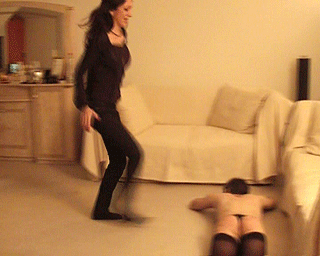 In this clip you can see my slave doing whatever I want him to do for my fun. See my ridiculous slave kneeling in front of me until I order him to stand up and to dance for me. I am laughing about his red ass that I hit with 1000 strokes before and about the way he dances with one leg only. After that he is ordered to lay down on the floor and I am starting to trample him and I am even jumping on him. I am jumping on his back and ass a dozen times and you can hear him queek under my weight. While standing on his body, I am telling him how I am going to use him and he knows that it will be very humiliating. At the end of the clip he has to crawl away to get dressed because I want even more fun.