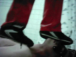 In this clip you can see me stepping on my slave`s balls and walking over his body and his face with my old stinky sneakers. He gets several body, ass and ball kicks and I`m spitting over the slave, before I allow him to put off the stinky sneakers from my feet and to put on the red boots with the dangerous metal heels. He has to sing a stupid song and I`m laughing about this idiot... Then I`m f o r cing him to smell my stinky sneakers and decide to fix one of them over his nose and mouth with sticky tape, because I want him to smell it all the time. See how stupid this idiot looks with the second sneaker over his head! Then I am having fun with my slave`s balls and dick. See me pushing the sharp metal heel deep into his balls and he is in real pain! But that`s not enough: I am kicking really hard into his exposed balls and having fun! After the CBT and ballbusting with my dangerous metal heels, the slave is laying on the floor and is happy that I allowed him to serve me...