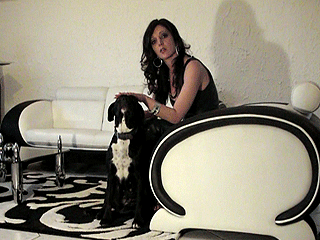 Today I will explain and show you the difference between a noble dog and a cur like you. Here you can see your divine Goddess with Lady Tyra talking to you and humiliating you. My dog Lady Tyra is a wonderful animal and I love her and compared to you, she is a precious animal. But you are only a filthy scumbag, a little piece of shit and the only reason for you to life is to give me everything you have. In this clip are allowed to see something that you will never ever get. Watch my beautiful butt coated in black leather and I bed you would love to be my cushion. YOur dick is so tiny and you are so stinky - you can only get some of my divine attention if you give all your money to me! In this clip I´m showing you your place, dirty little cur!